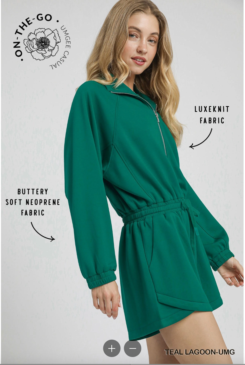 Say hello to your new throw-on-and-go favorite: the Luxe Knit Half Zip Romper in the dreamiest Teal Lagoon. Made from our signature buttery-soft Luxe knit neoprene fabric, this romper feels smooth, stretchy, and ultra-comfortable while still looking effortlessly put together.